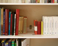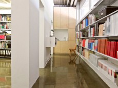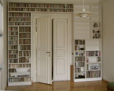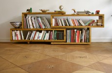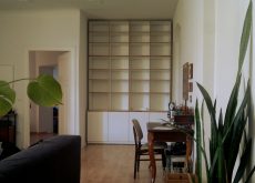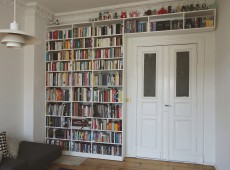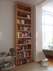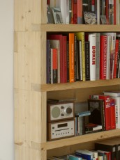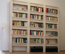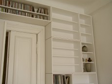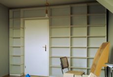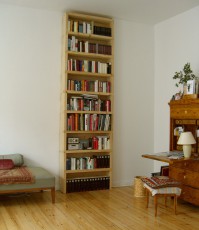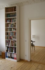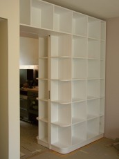 Bücherregal als Raumteiler, dreiseitig, mit integrierter Schiebetür.