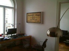 Aufarbeitung und Rahmung eines historischen Ladenschildes aus bemaltem Nadelholz.